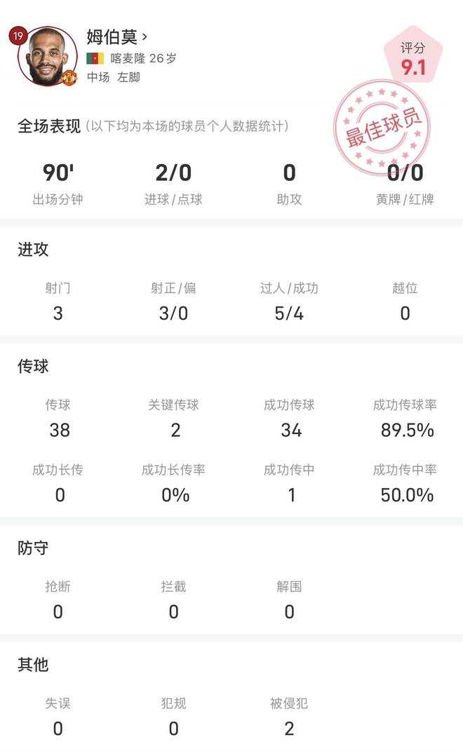 姆伯莫战布莱顿全场数据:梅开二度,传球成功率89.5%