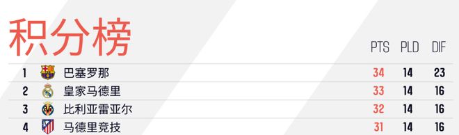 新赛季西甲联赛赛程已然完成三分之一,积分榜前四却形成等差数列,榜首巴萨只领先第四位马竞3分,呈现出24年来最胶着的争冠开局,追平2001-02赛季14轮过后积分榜前四的最小分差,也让巴萨马竞两队本周中的直接较量愈发引人关注。皇马巴萨双雄争霸的老套剧本改换成“驷马齐驱”的开场剧目,为西甲联赛增添几分新意和悬念。显然这样的局面也是西甲联盟主席特瓦斯所乐见的。