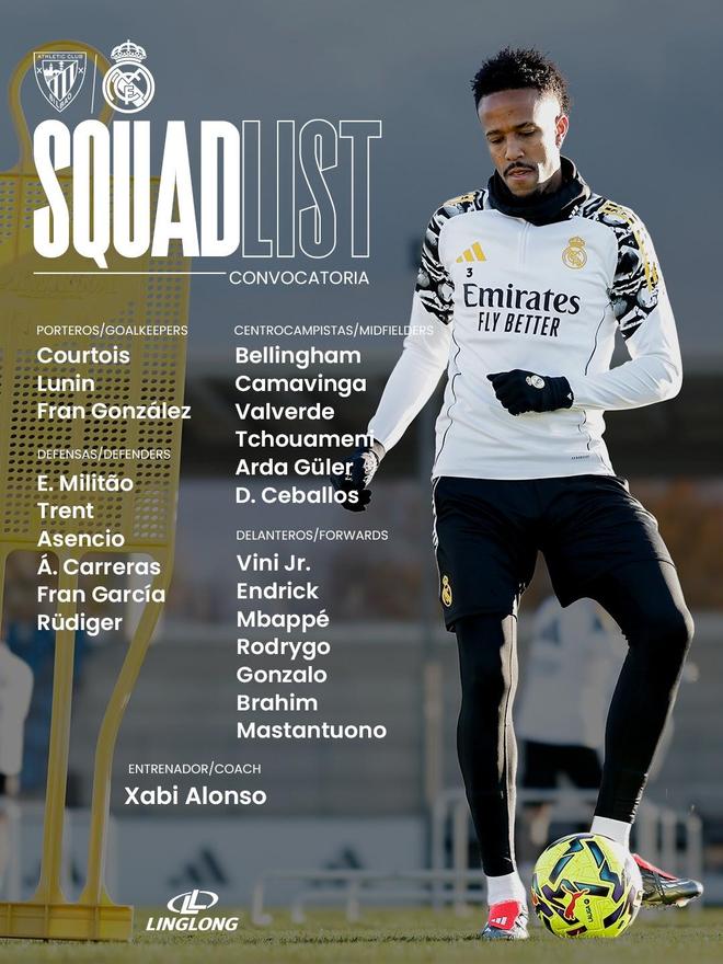 北京时间12月4日凌晨2时,皇家马德里将在西甲第19轮客场挑战毕尔巴鄂竞技。皇家马德里方面公布了球队此役的大名单,姆巴佩领衔,此前患上流感的劳尔-阿森西奥回归。
